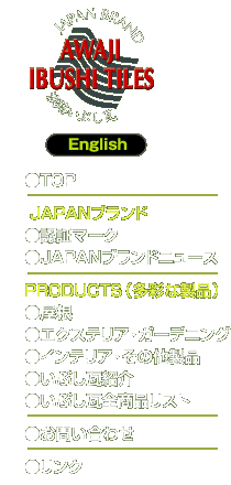 English いぶし瓦全商品リスト いぶし瓦紹介 お問合せ・リンク お問合せ・リンク インテリア・その他の商品 エクステリア・ガーデニング 屋根 最新ニュース 認証マーク English